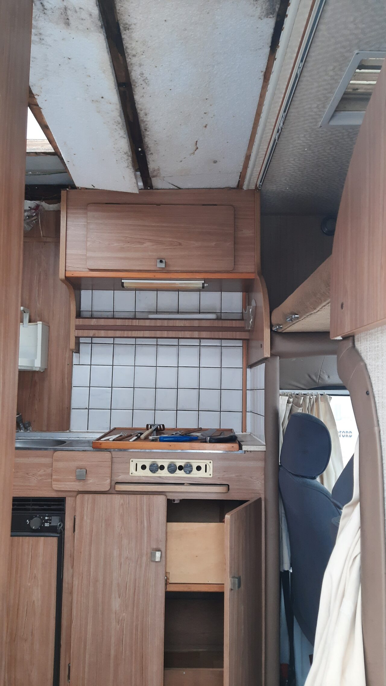 De camper heeft in het midden aan het plafond vocht schade door slechte dakluiken